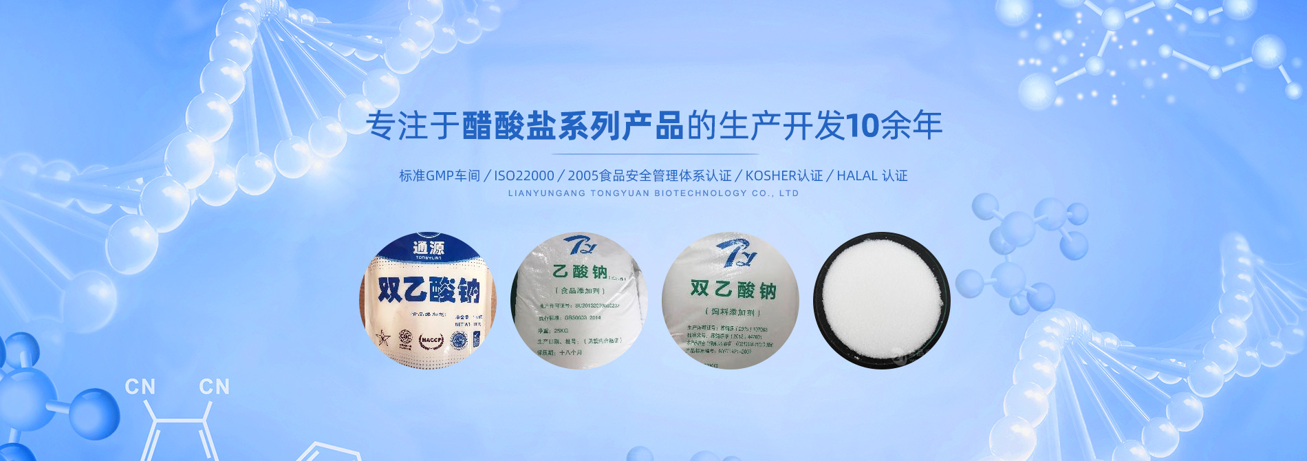 連云港市通源生物科技有限公司 是生產雙乙酸鈉、無水醋酸鈉、三水醋酸鈉、醋酸鉀、乙酸鈉、丙酸鈉、丙酸鈣和氯化鉀等系類醋酸鹽產品的專業(yè)制造商。公司專注于醋酸鹽系列產品的生產開發(fā)10余年,是國內專業(yè)醋酸酸鹽產品生產基地。 目前,我們已和全球30多個國家和地區(qū)建立長期的業(yè)務合作關系,是中國較大的雙乙酸鈉生產商和出口商之一。作為中國食品添加劑和配料協會理事單位,通源公司已建成標準GMP車間5000余平方米,通過了ISO22000:2005食品安全管理體系認證、KOSHER認證、HALAL 認證等,這些都是我們提供高質量產品和優(yōu)良服務的前提和確保。 生產出色產品,提供優(yōu)良服務,滿足顧客需要,是我們努力的目標。愿和我們的朋友們攜手,共...